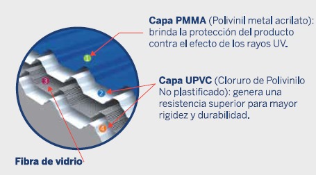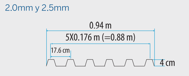 Cubierta termoacústica fabricada en UPVC Y PVC espumado en su interior con propiedades de reducción térmicas y de sonido, reforzada con una maya de fibra de vidrio para mayor durabilidad y resistencia, 0.88m de ancho útil y espesores 2,0mm y 2,5mm.